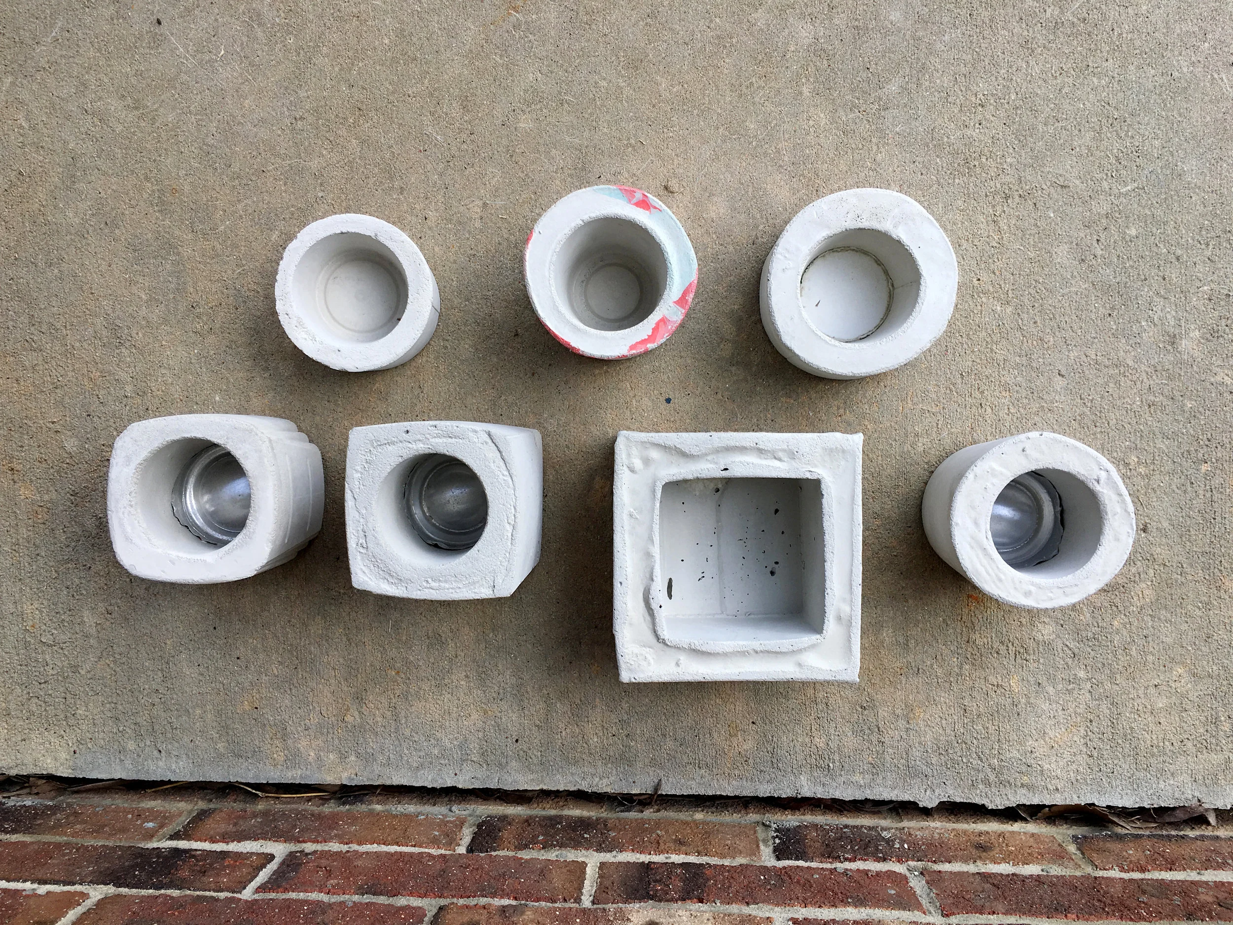 Make sure the molds are made of plastic. No aluminum or metal of any kind. It is too difficult to remove the set concrete from the metal molds. I found any plastic container or glossy paper carton (ice cream or juice cartons for example) work the best. They can be cut or torn off of the set concrete easily. I learned this the hard way. After spending an afternoon making planters, all of the planters that I used soda cans as the inside mold sat in the garage for a couple months before I gathered up enough courage to deal with them. To remove the cans, I had to use a utility knife and cut it out as best as I could. The bottom portion remained in the planter due to difficulty getting it out. Any planters that I used cardboard as the mold had paper stuck on the outside and the cardboard left a texture on the concrete. So in the end I recommend plastic and glossy paper!