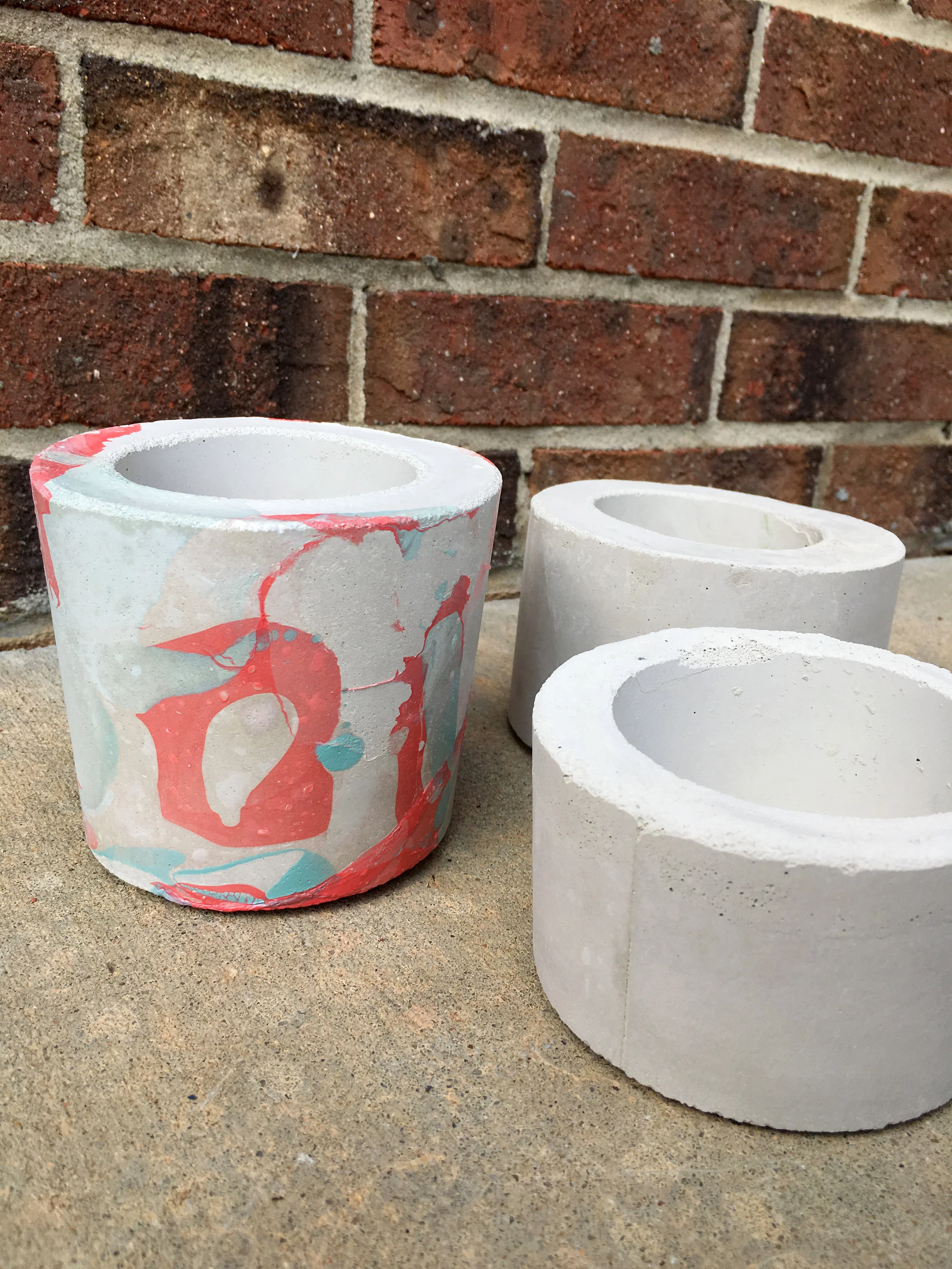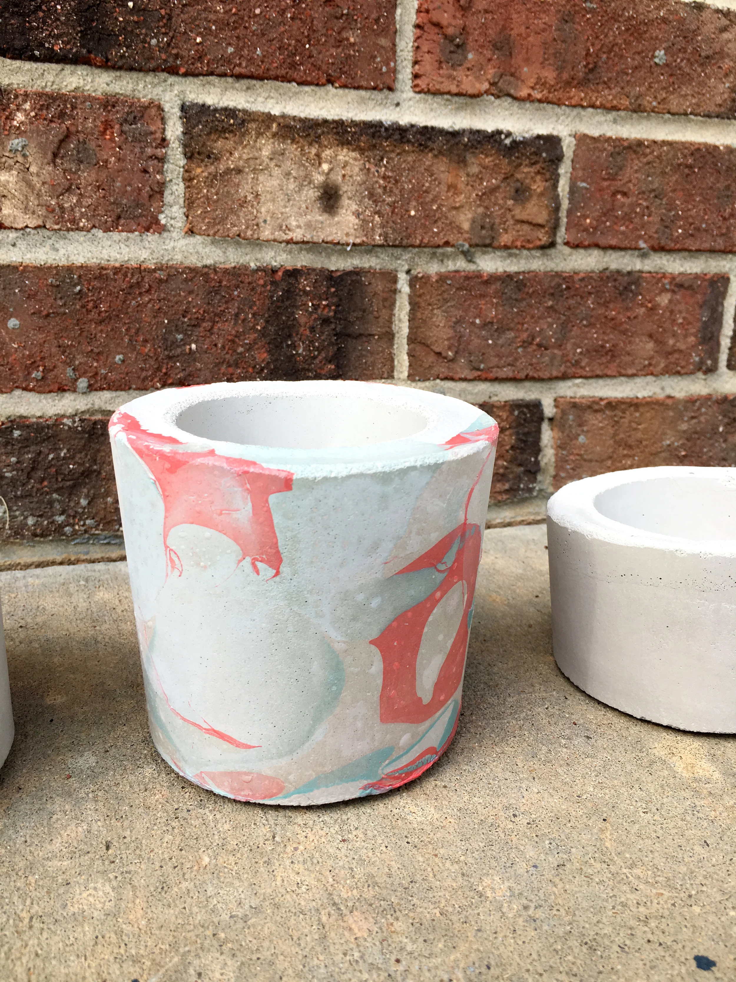 I wanted to experiment with painting the planters so I tried a marbling technique found here using nail polish as the paint. It turned out alright. At first I thought it did not work because the marbling would peel off when I touched it. I let it sit and dry for 24 hours, planning on peeling it all off, but it dried and stuck to the concrete. It has a few bubbles in it so the technique is not perfect, but it is easy and inexpensive because all the tools are available on hand. I would like to keep playing with the marbling to see if I can get something to work.