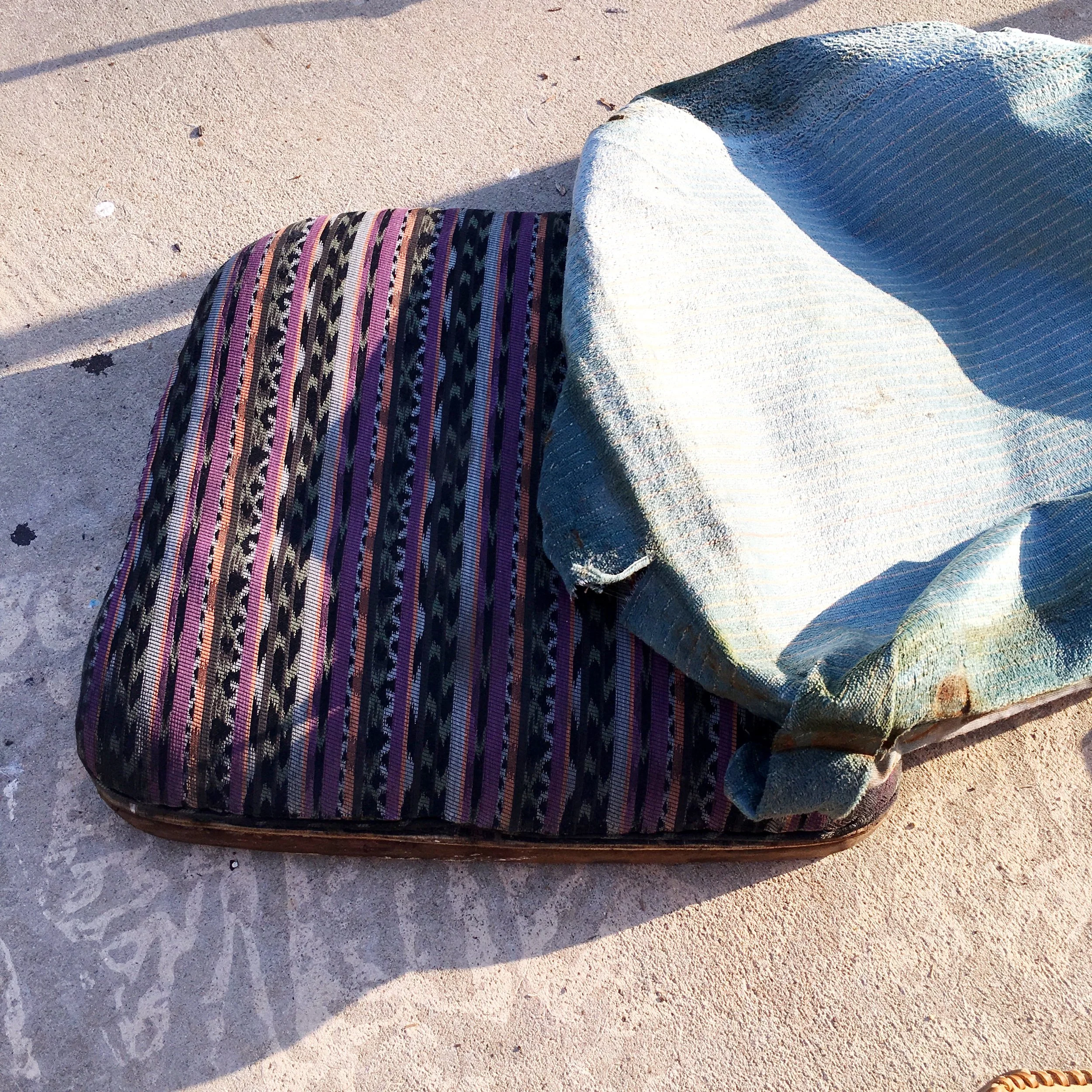 In this scenario, there was another layer of fabric beneath the first layer. It looked clean enough, and we didn't feel like taking the second layer off so we left it on and covered it like who ever recovered it last time, our neighbors perhaps?