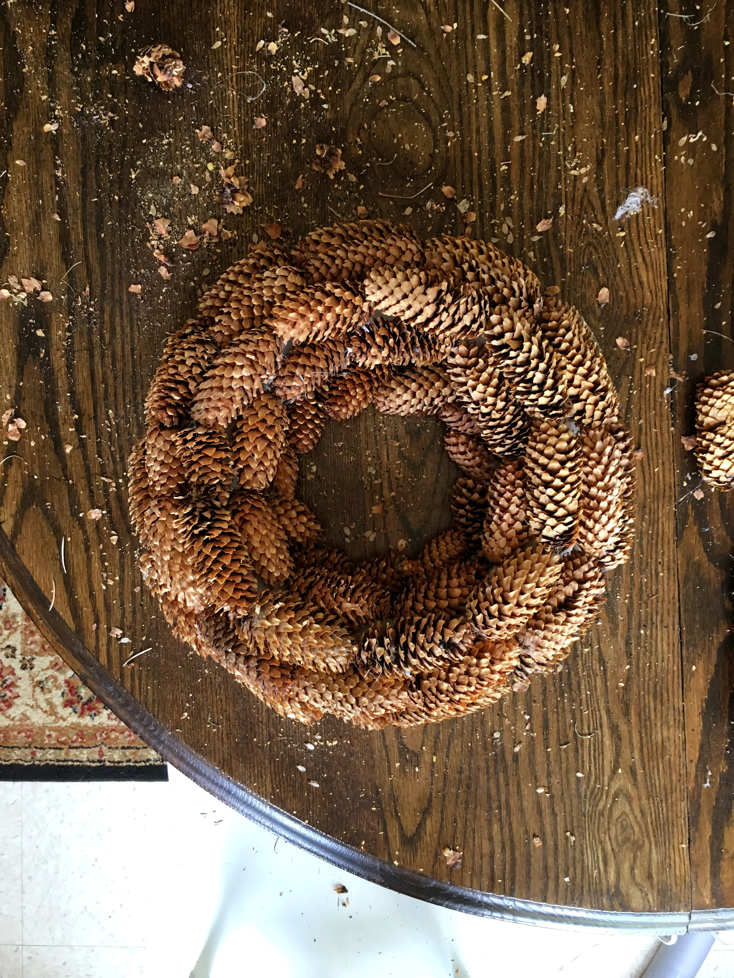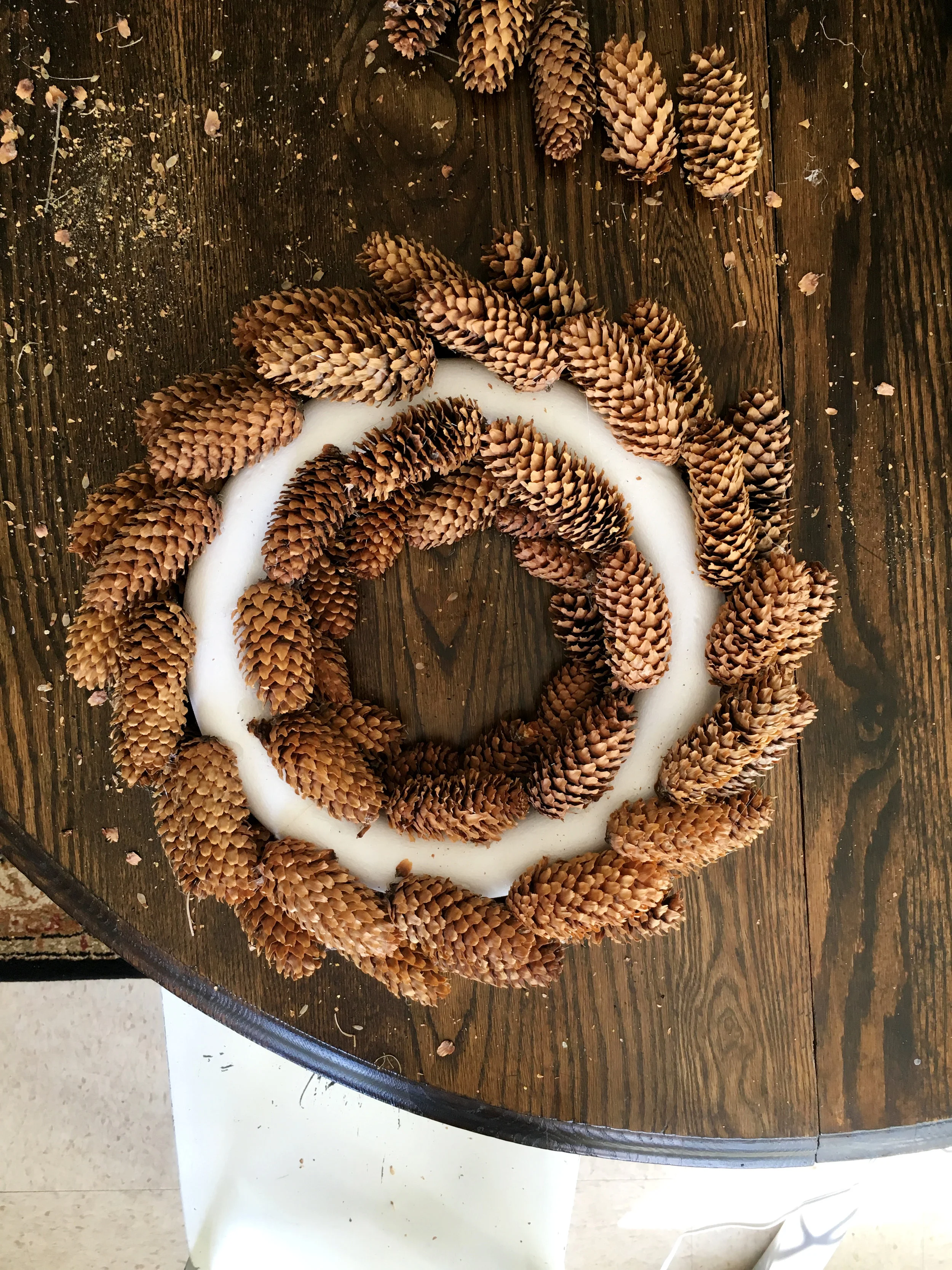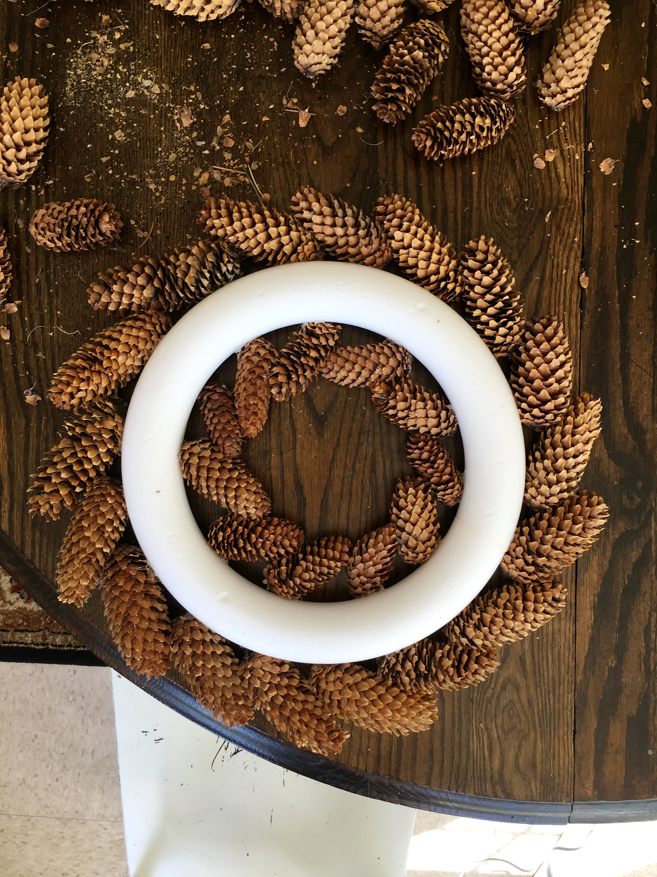 Glue a layer of pinecones on the outside and inside of the wreath form. Note, I did this step twice because I got to the end and realized that I did not have enough pinecones. Having collected my pinecones three years ago, I had no way to get more. The first time I did this step, I slightly layered the pinecones. Next time around, I had the pinecones in a line, butted up to each other. This took a lot less pinecones and made it possible for me to finish. Either way is great, just make sure you have a way to get more pinecones in case you run out.
