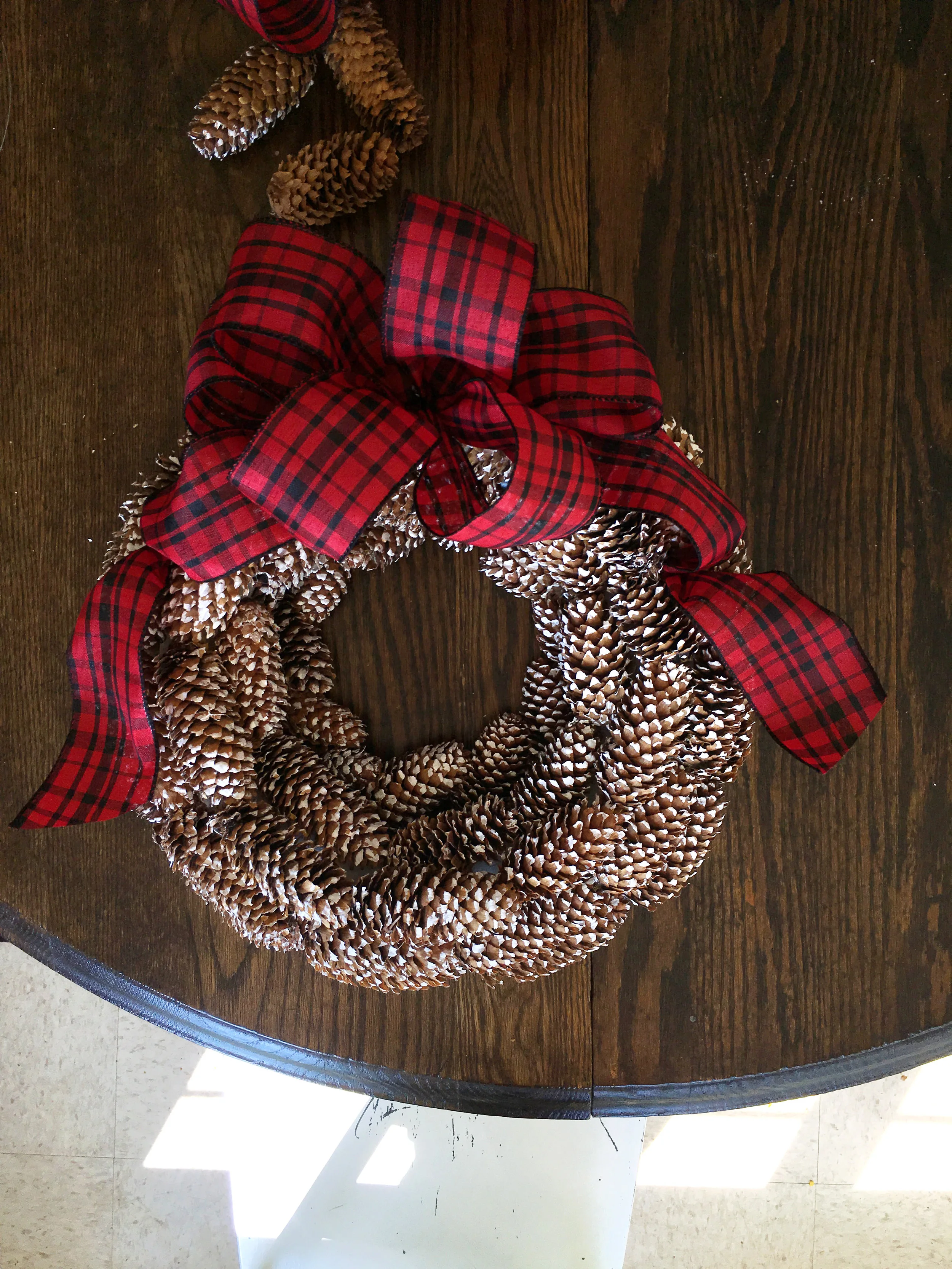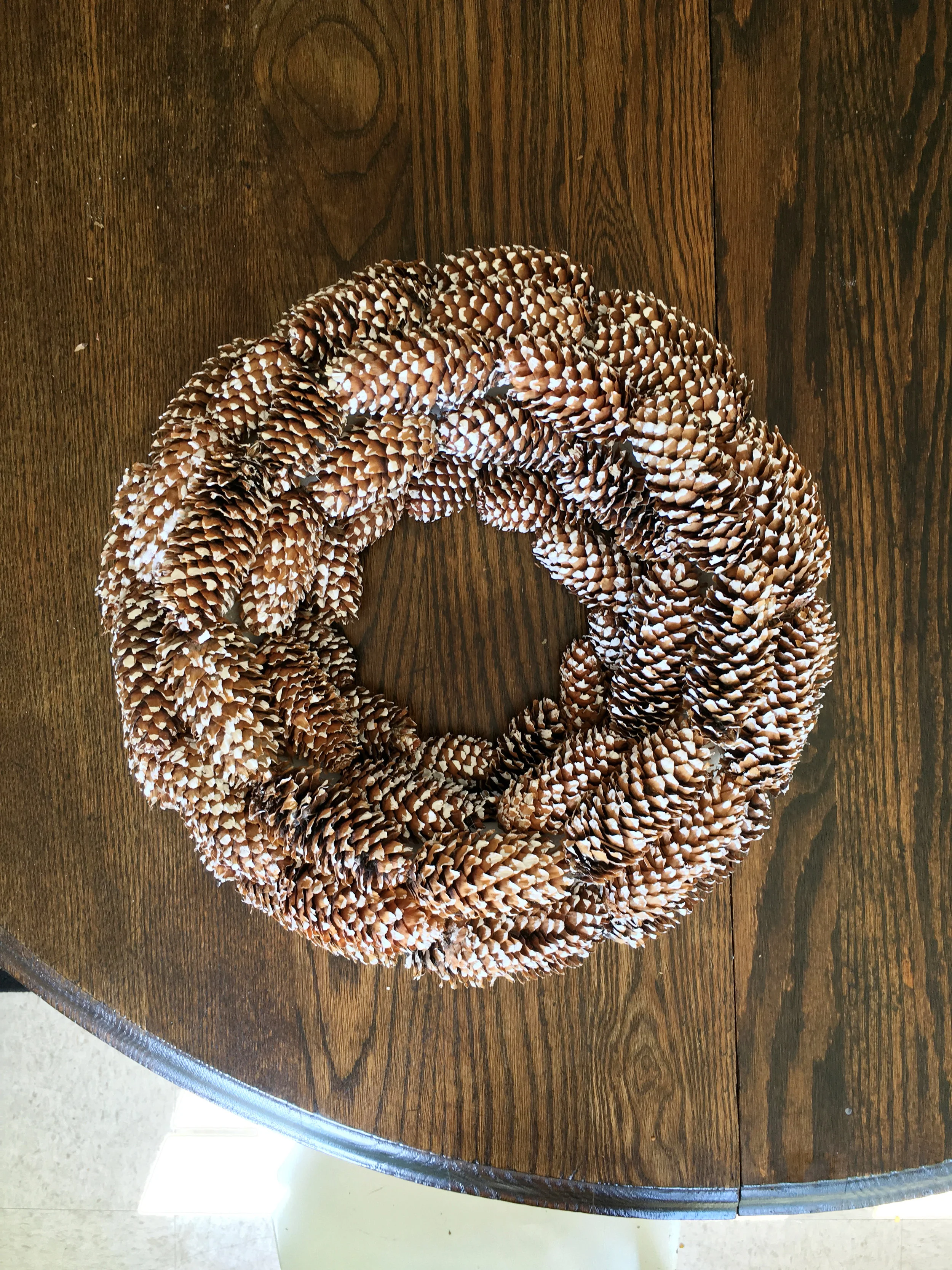 MATERIALS: Wreath form, hot glue gun and glue, pinecones, white and brown paint.