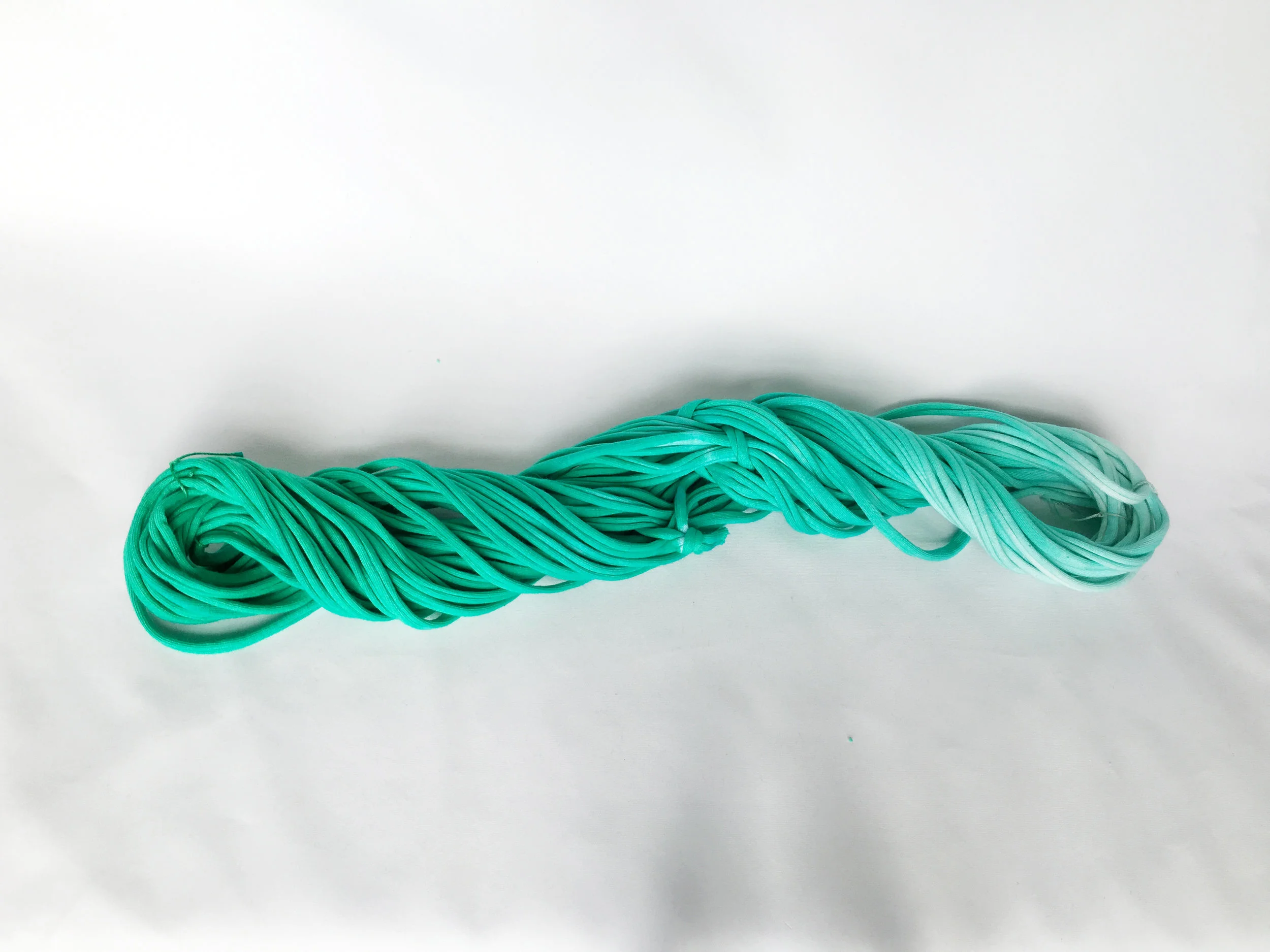 The first day I dyed the cotton t-shirt yarn using the vat dyeing method, which means dyeing it in a bucket (or a pot) with no heat and adding soda ash to fix the dyes. I made Jake choose the color and effect, so a sea-foam green ombre it was! The result was great and it motivated me to keep going. And I would have kept going except for a little voice watching me from the high chair telling me she was done with it.