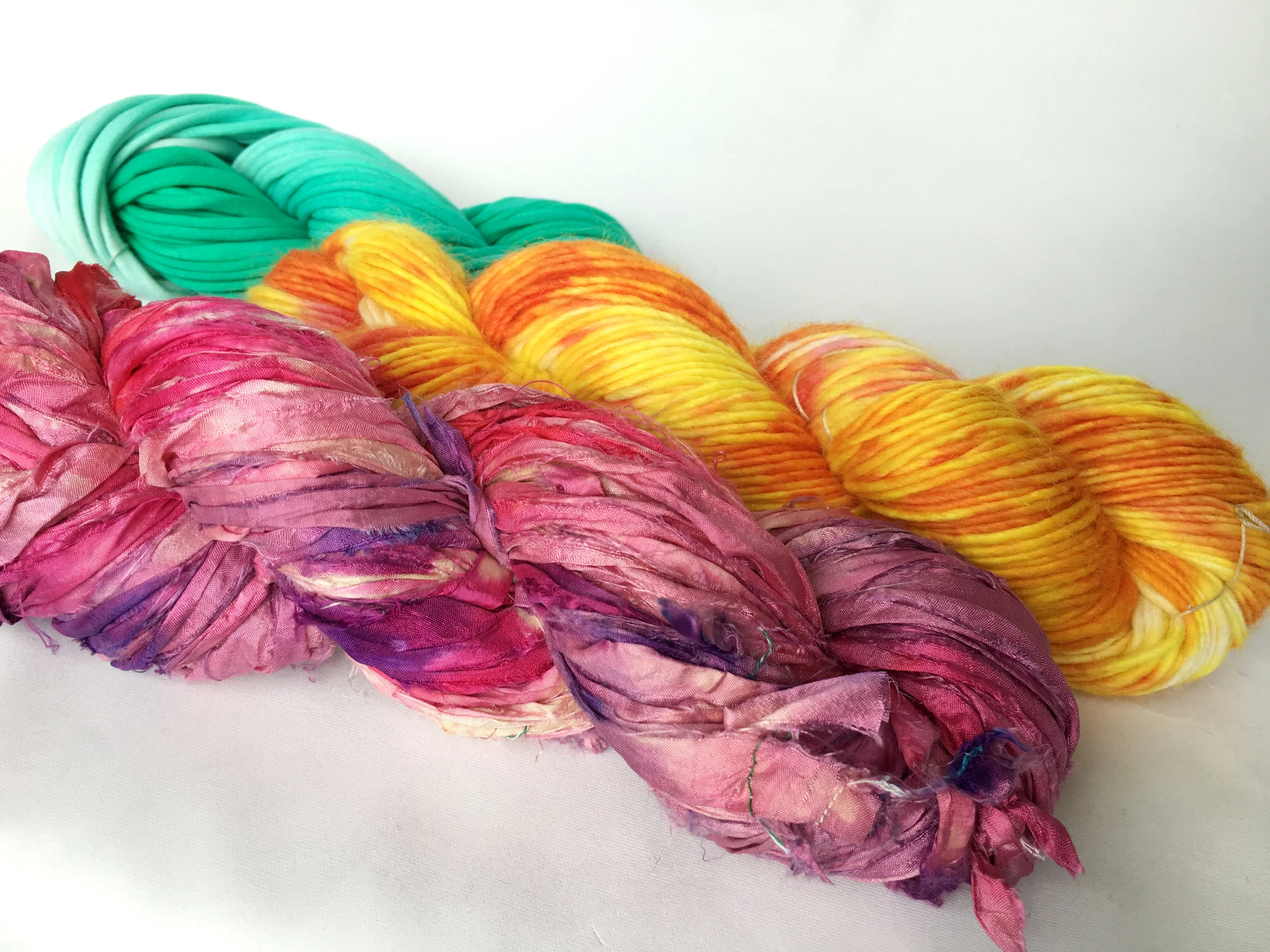 The next day I dyed the silk ribbon yarn and the wool yarn using the acid dyeing method, which means dyeing it in a pot over heat and adding citric acid to fix the dyes. I tried to dye the silk coral, fuchsia and red-violet in a variegated manner. The colors turned out more hot pink and grape soda purple. Not what I was after, but still lovely. (It actually turned out to be my favorite once after seeing it dried and in the daylight. I love the way the silk plays with the light.) The wool I dyed yellow with fuchsia drips all over, creating a variety of oranges, in a low immersion dye bath. I had no clue what to expect with that one. It reminds me of tie dyeing t-shirts, but tie dyeing is actually another effect so I will have to get more yarn and try that and see how the results differ. There are a lot of effects and it seems as though no matter what colors and combos are tried, it turns out awesome! Gather up your own supplies and give it a try.