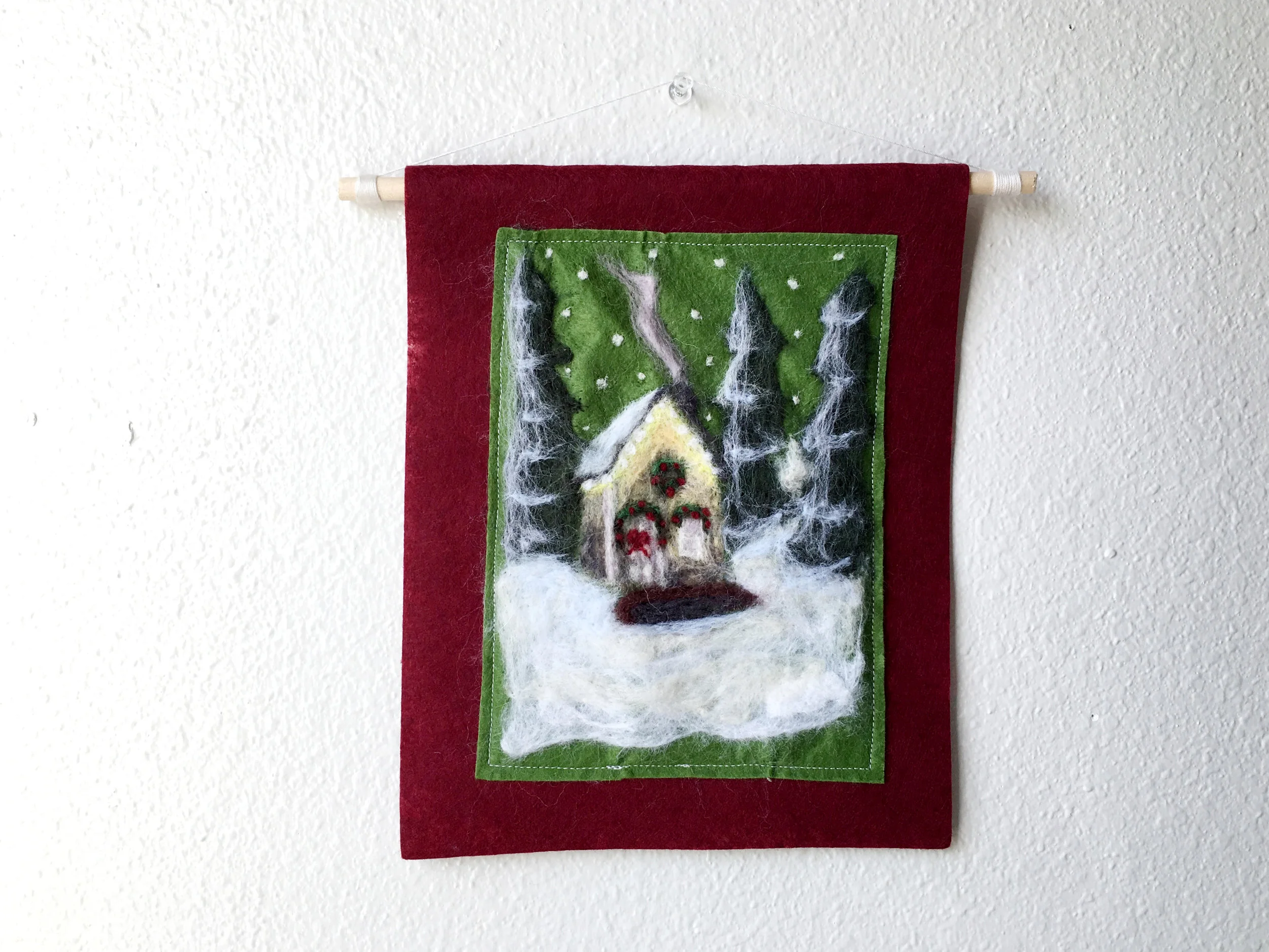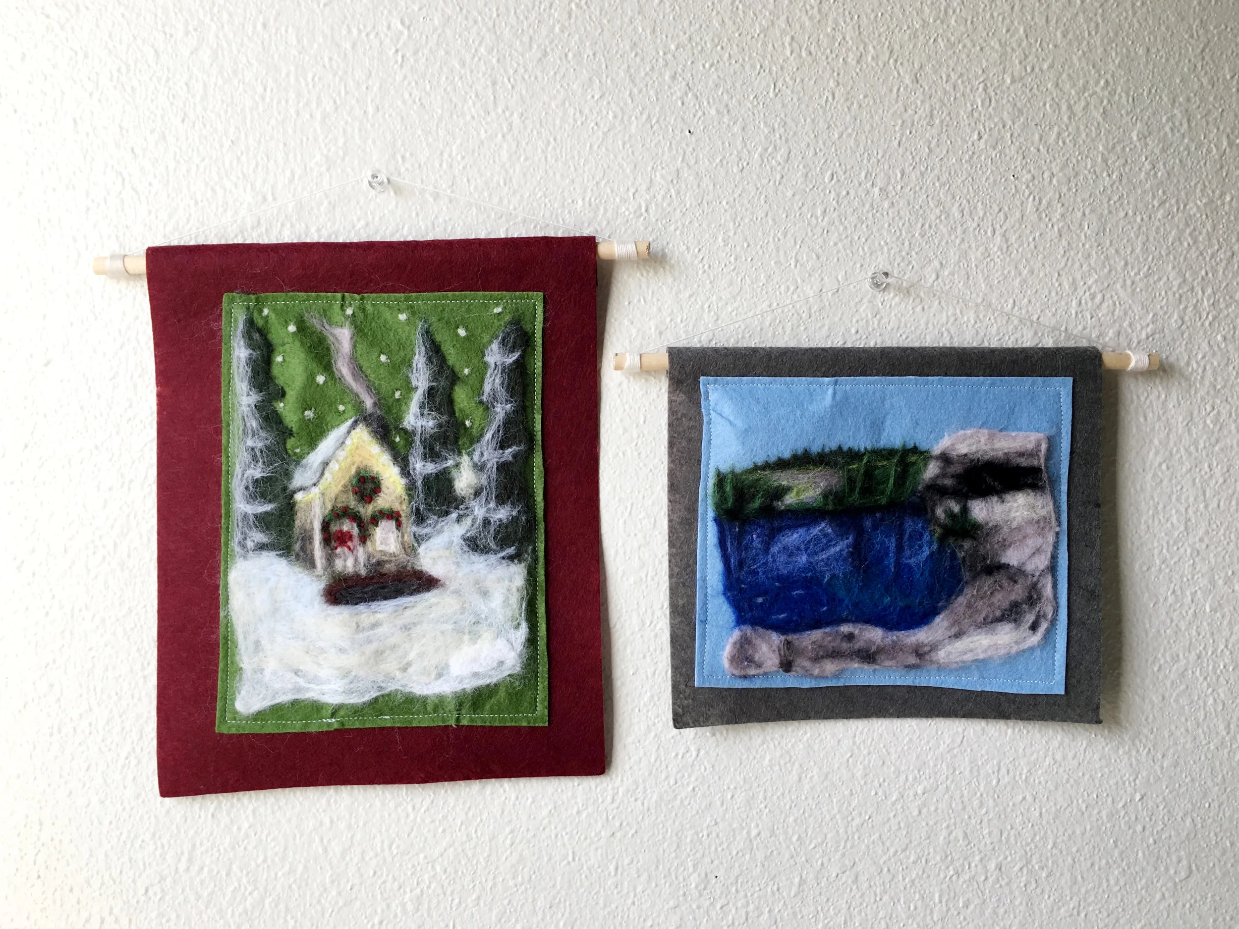I had a lot of fun felting the dog portraits so I wanted to try my hand at felting landscapes. This was a lot more difficult than I imagined it would be. I believe with a lot more color options and a lot more faith in myself, it would not have seemed so daunting. Thankfully I have an awesome brother (who is an artist therefore connoisseur of all things art- logical, right?) who put up with a couple days of constant texts and pictures from me asking if they looked right or what I should add. Geez, when I type it out it is obvious that I need a little more courage. After I completed them I hung them on the wall in my living room so I could look at them every time I walked by. A few days was all I needed. My brother was right, they were perfect.