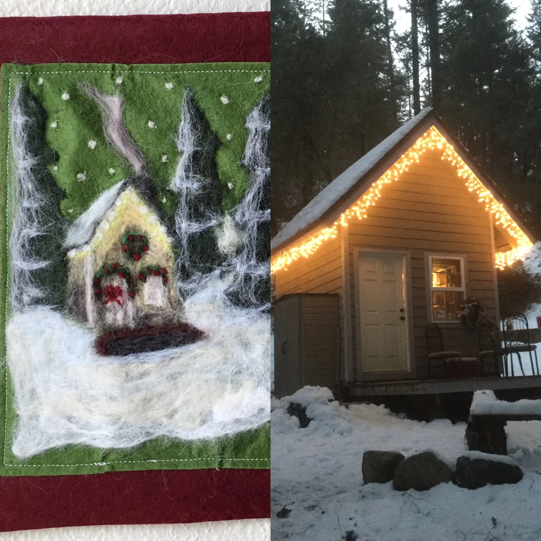 The cabin painting is for my dad and step-mom. They have a cabin out in the woods that they frequent almost every weekend all year long. It is their heaven on earth. I used a picture my dad took of their cabin and used complete creative freedom. It's how I imagine it looks at Christmas; I have only been there in the summer.