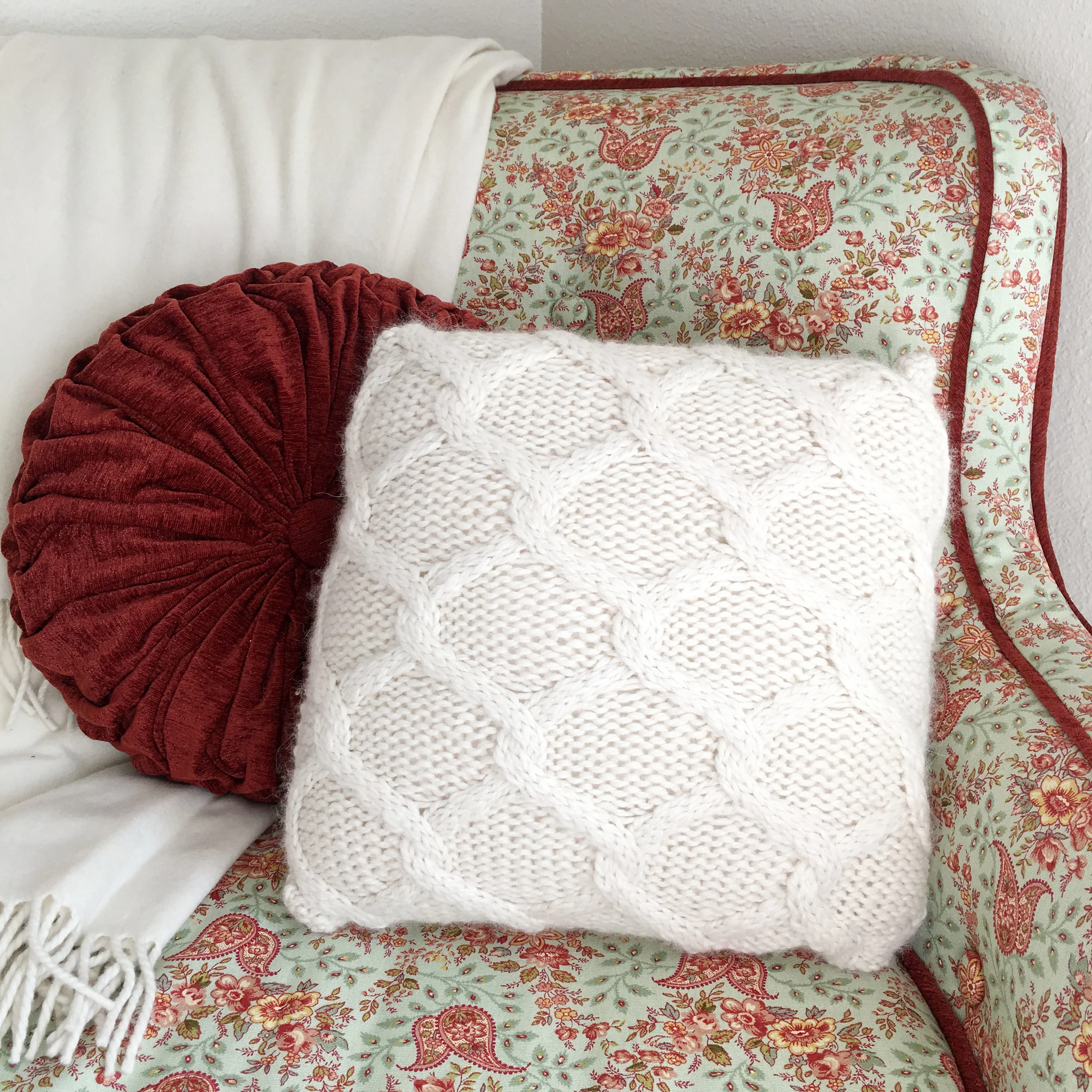I was gifted the most soft and fluffy skein of alpaca yarn for Christmas and I immediately knew what I wanted to make with it. Freya and I both could not stop ourselves from snuggling the yarn so I knew it would make a perfect pillow. I have never knit a pillow before and I have not written my own pattern so this project was a first in many ways. I found a cable motif that I really liked and moved forward from there. I am hoping to release a pattern, but there are some minor adjustments that need to be made before I do so. I guess I will have to make another cuddly pillow... bummer. Send me a message if you are interested in test knitting the pattern when it is ready.