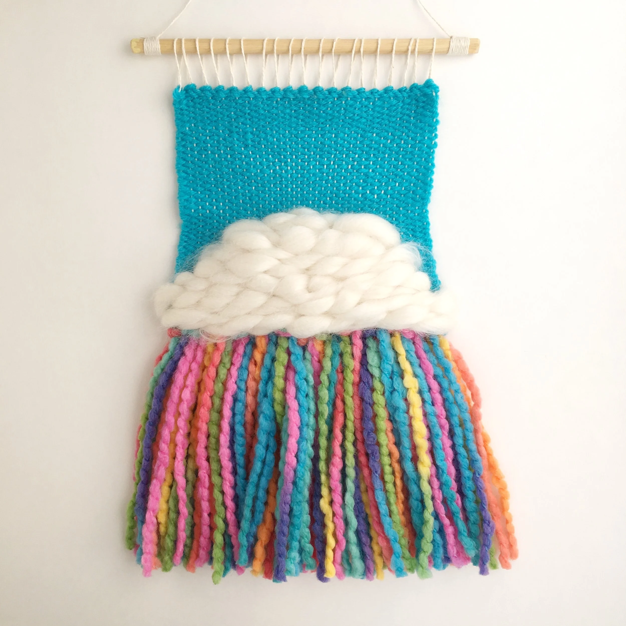 I am inspired by the weaver Sunwoven. She is based in Charleston, SC and makes modern weavings using a lot of roving. I decided to make a weaving inspired by her style and came up with my pink weaving. As I started weaving and put in the first cluster of roving, I had an idea. It looked like a cloud and I could use to the fringe to create a rainbow. It was a simple enough idea and would be adorable for certain! I looked around online first because I was positive someone would have done it before, but I did not find anything. Awesome, now it HAS to be done!