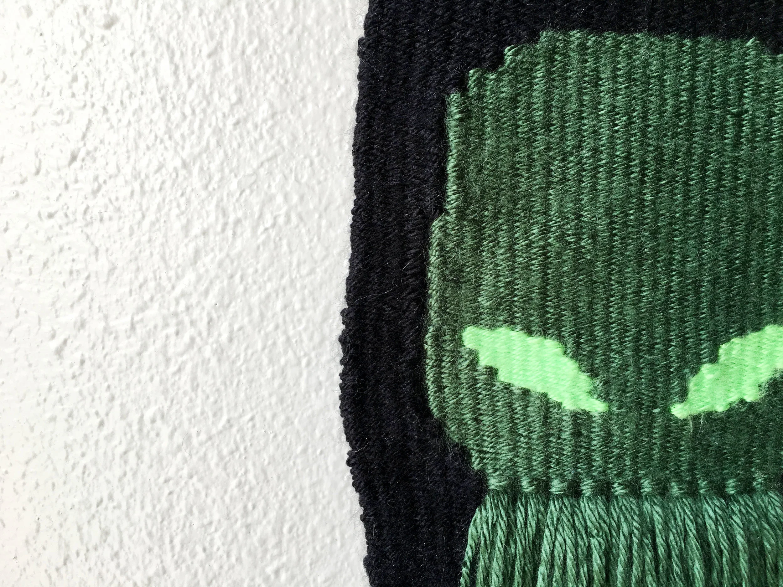 Cthulhu is a great beginning weave. The shapes are very simple and gave me a no pressure chance to practice. I made it up as I went along and I could not be happier with it. For the eye shapes, I used a sharpie and drew the shape onto the warp so that I would have better luck achieving the actual shape I wanted. I got that idea from my book, DIY Woven Art.