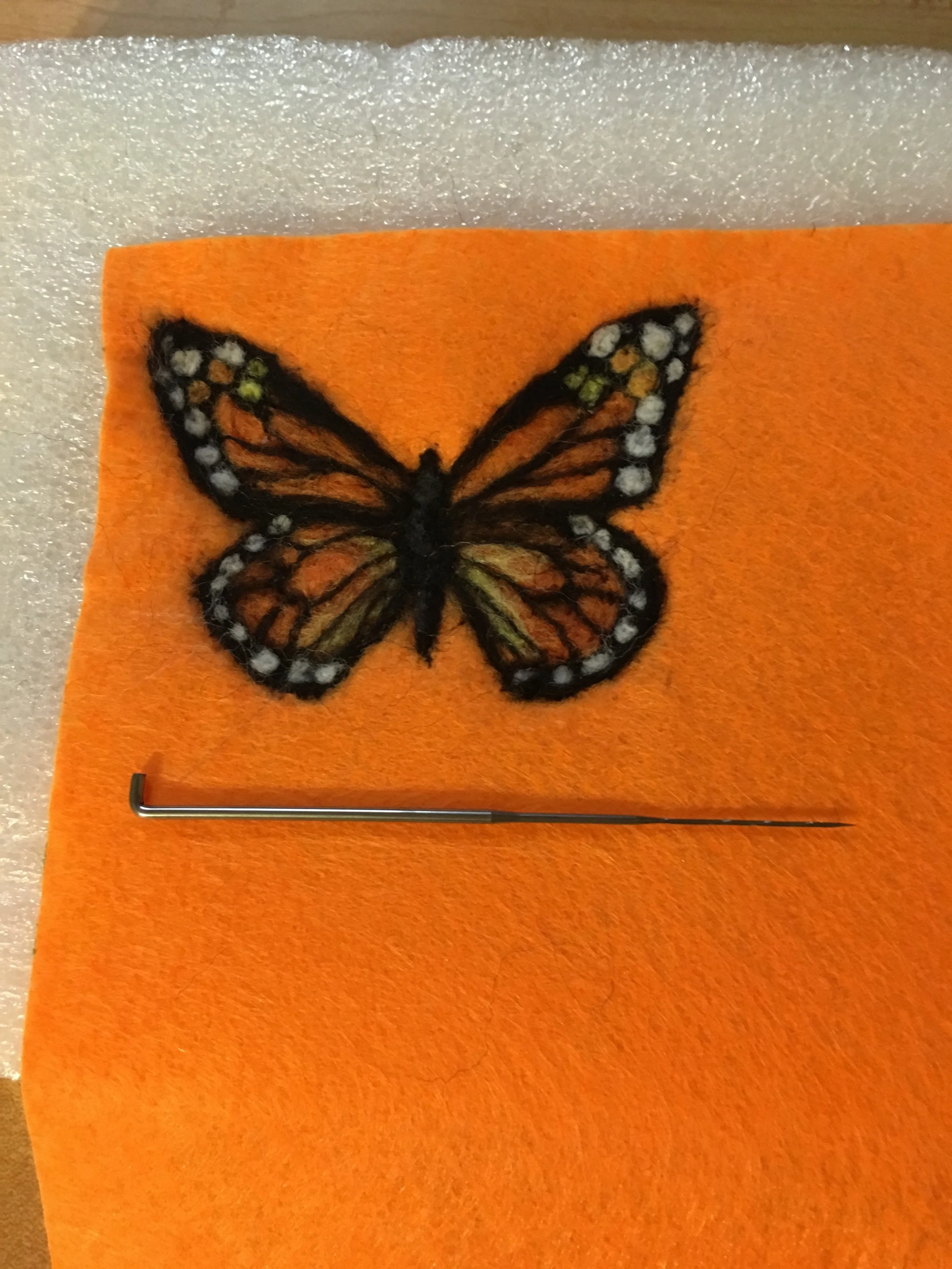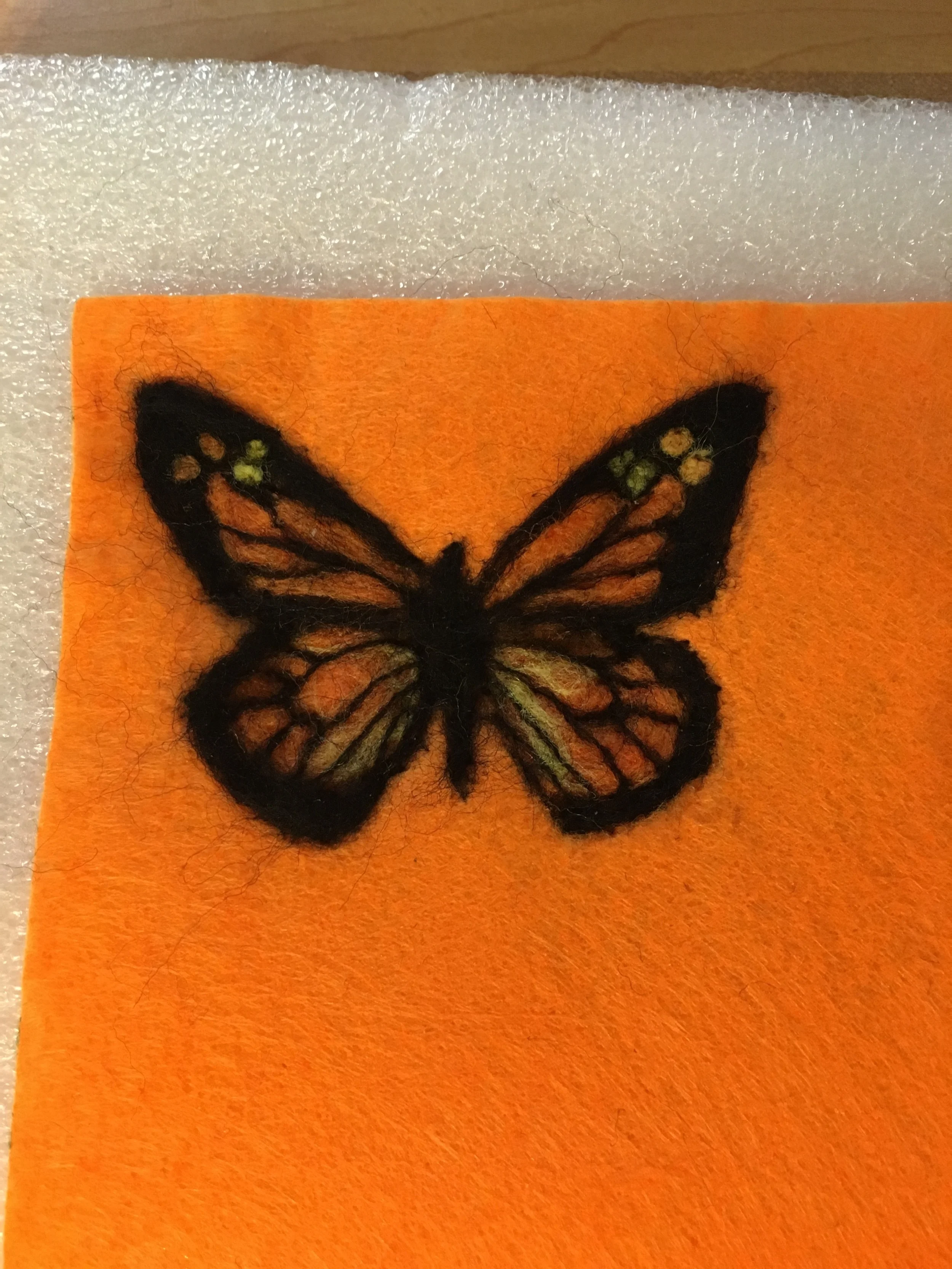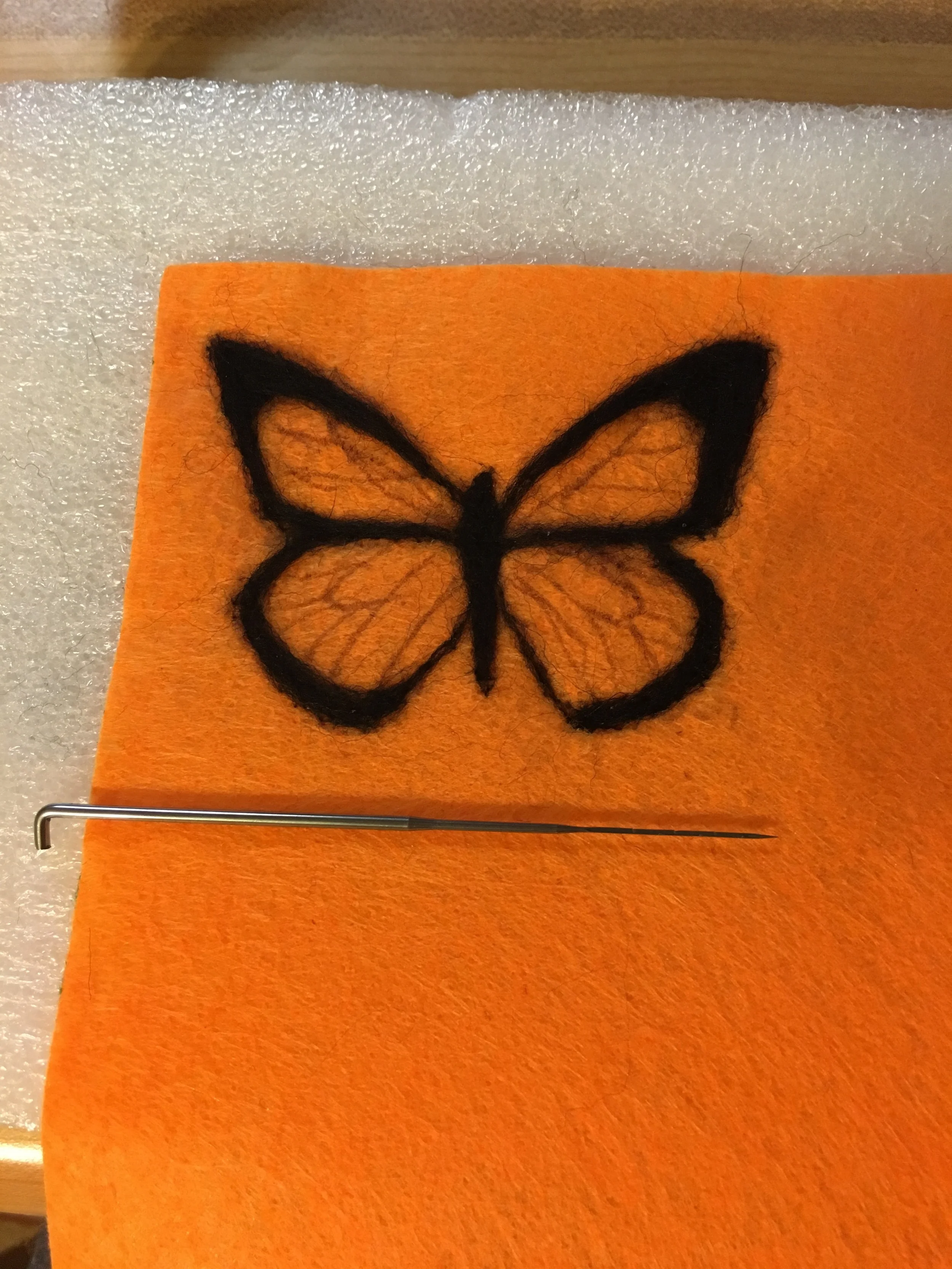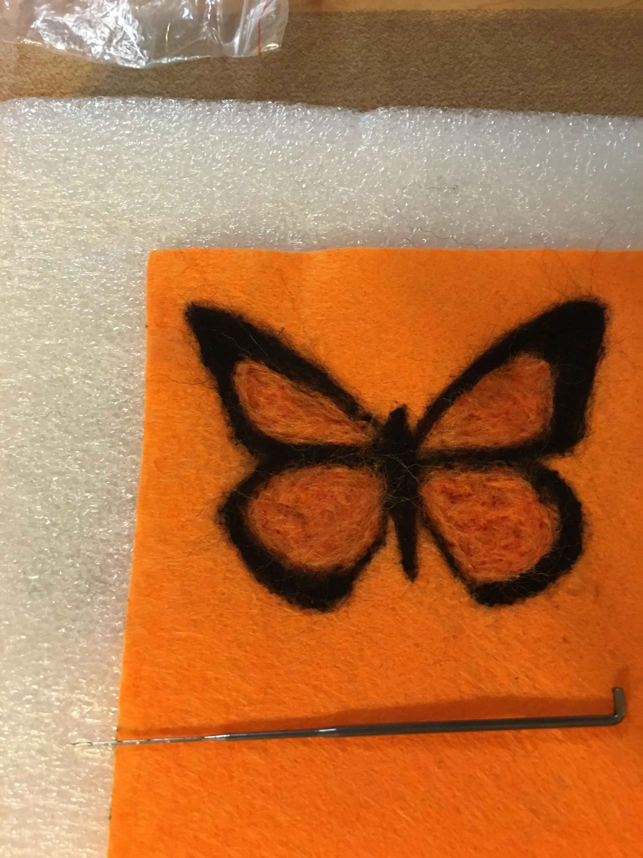 I have just discovered and fallen in love with painting with wool. Look up 'wool painting' on Google images, watch a few Youtube videos and you will see what I mean. The paintings are amazing! The style and character in each painting varies widely and it is not as messy as paint. Wool painting, or needle felting, is the process of punching the fibers into the felt and getting them all tangled up. That's the brief and simple way of explaining it. I decided to give it a try and I made a butterfly in just under two hours.