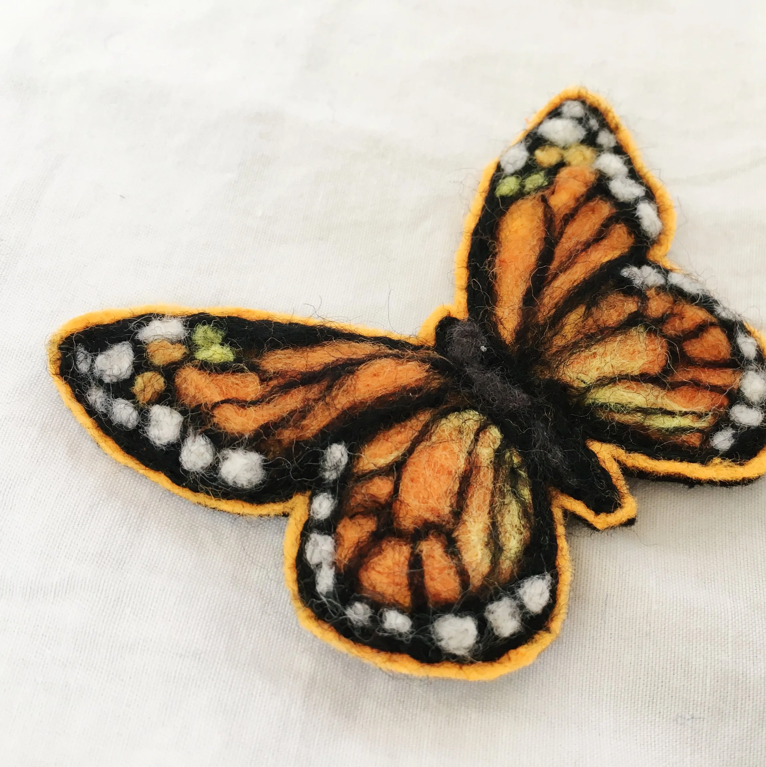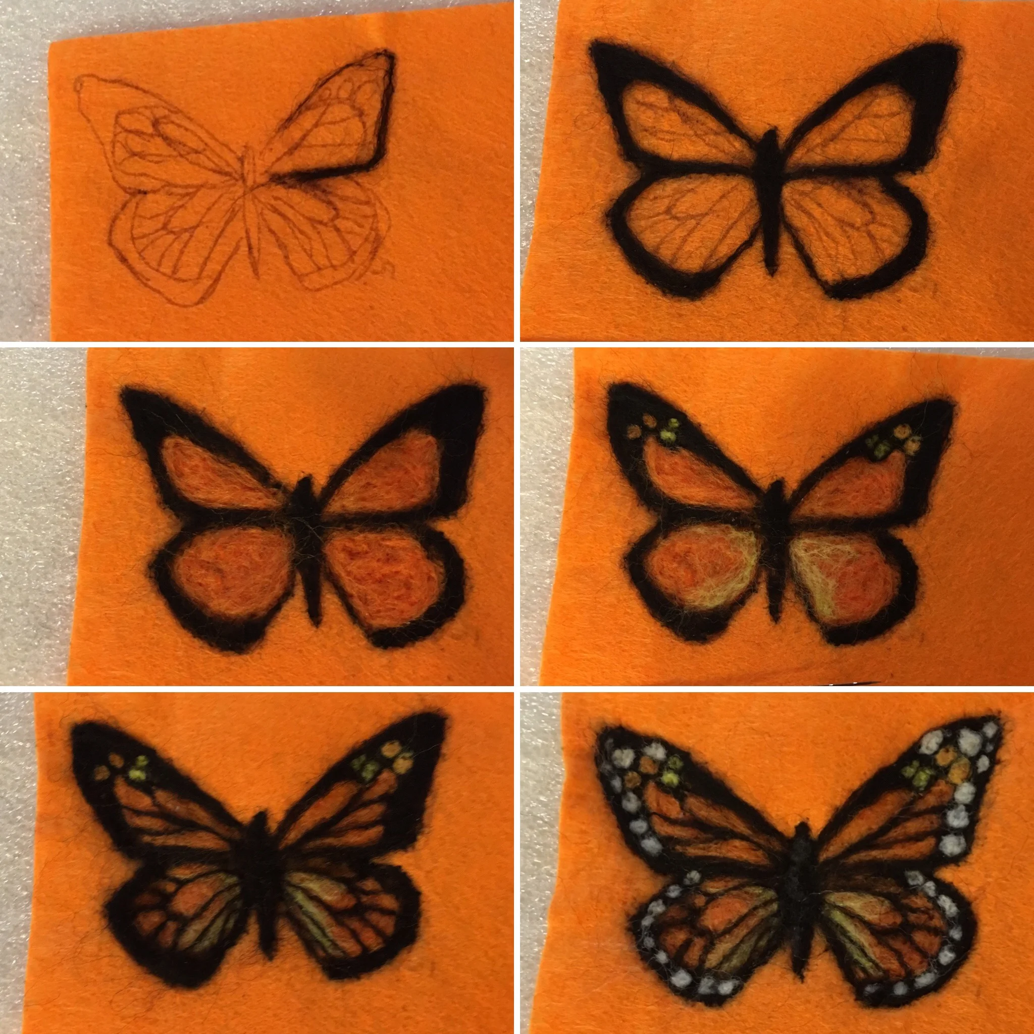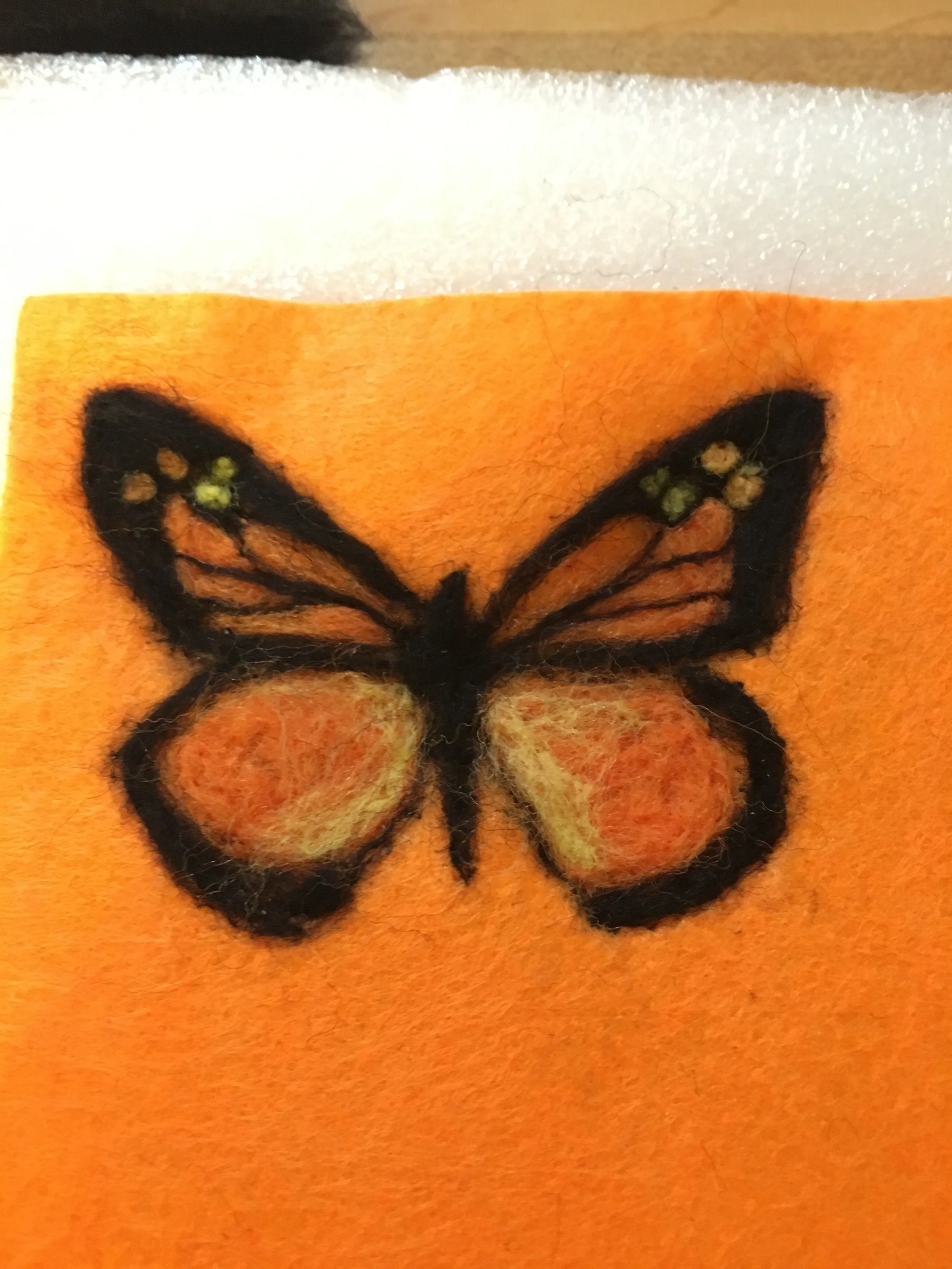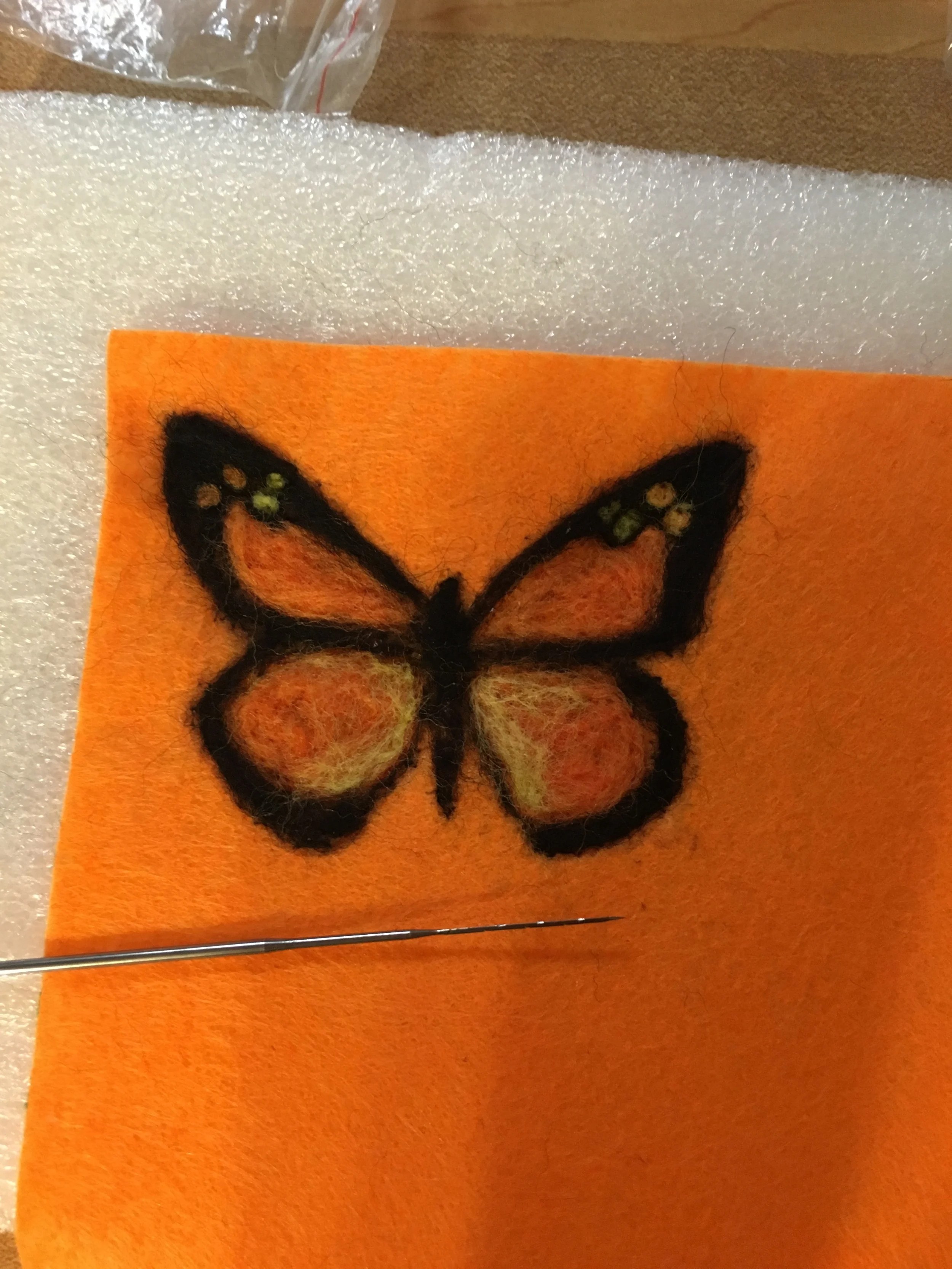 I have just discovered and fallen in love with painting with wool. Look up 'wool painting' on Google images, watch a few Youtube videos and you will see what I mean. The paintings are amazing! The style and character in each painting varies widely and it is not as messy as paint. Wool painting, or needle felting, is the process of punching the fibers into the felt and getting them all tangled up. That's the brief and simple way of explaining it. I decided to give it a try and I made a butterfly in just under two hours.